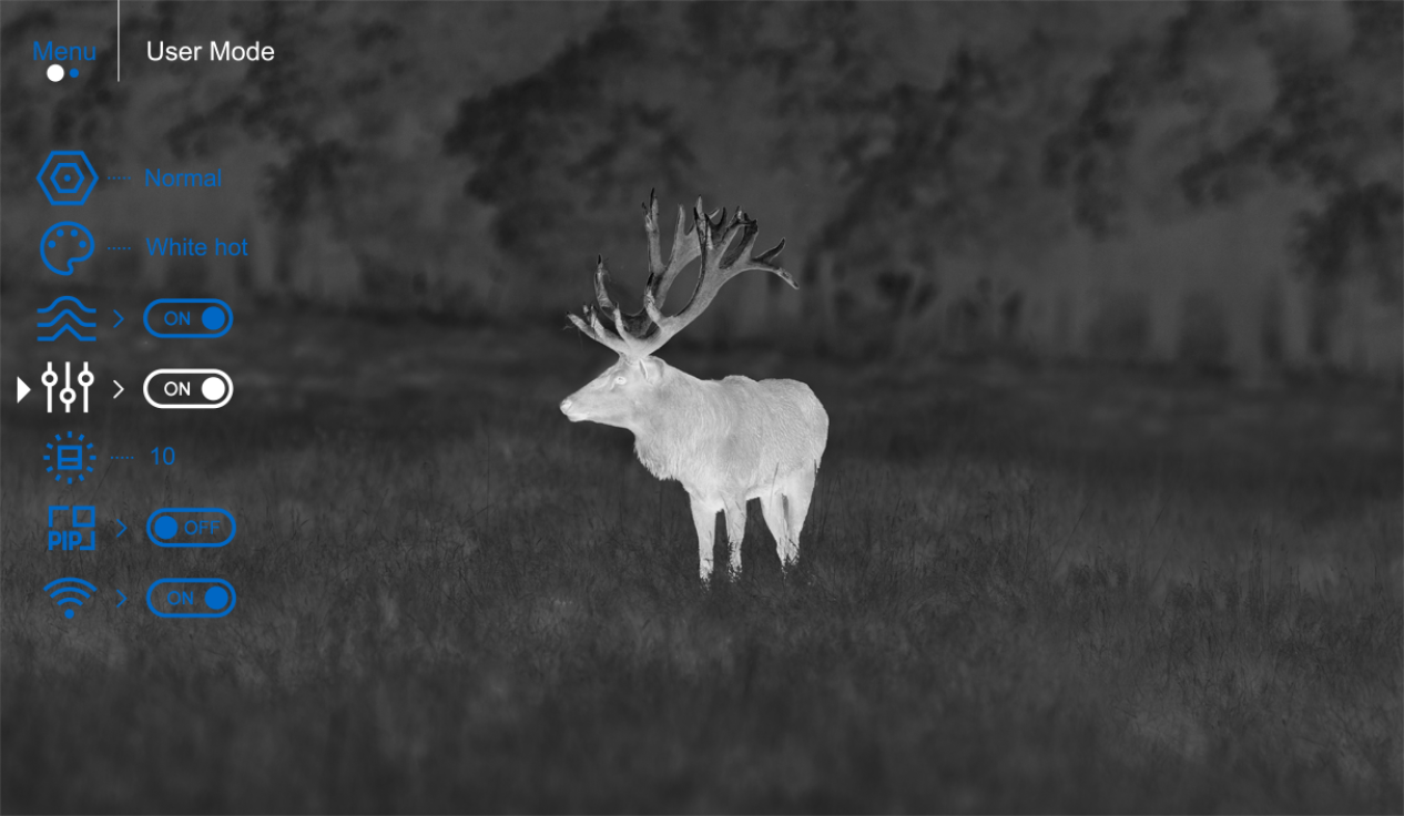 Der Wärmebildmodus dient zur Erkennung und Beobachtung von Tieren bei allen Wetterbedingungen, während der digitale Bildmodus eine verbesserte Zielidentifizierung in Full-HD-Auflösung ermöglicht. Die Bild-in-Bild-Funktion ermöglicht die gleichzeitige Anzeige von Bildern aus beiden optischen Kanälen, wobei entweder Wärme- oder Digitalbilder bevorzugt werden können.