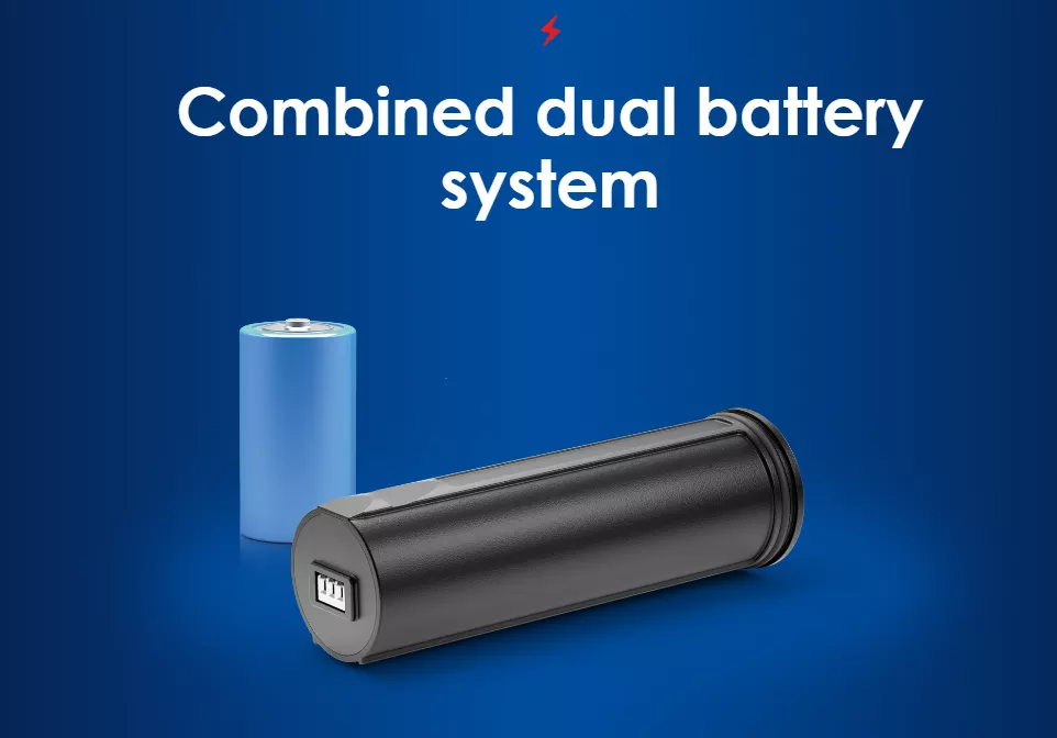 Stromversorgung durch zwei wiederaufladbare Batterien: eine interne 4-Ah-Batterie und eine austauschbare 3,2-Ah-Batterie, die mit einer einzigen Ladung bis zu 7 Stunden hält. Die Steckdose am Gehäuse des austauschbaren Akkus bestimmt die richtige Position, so dass Sie einen leeren Akku in völliger Dunkelheit mit nur einer Berührung schnell und sicher durch einen neuen ersetzen können.